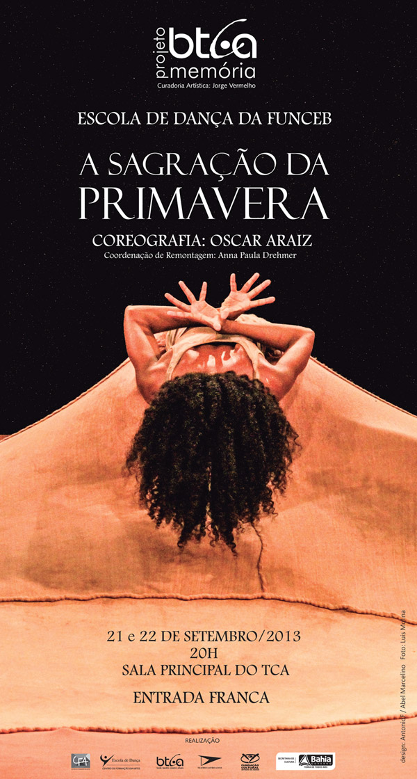 Nos dias 21 e 22 de setembro (sábado e domingo), às 20 horas, período em que se comemora a chegada da primavera, o Teatro Castro Alves (TCA) apresenta o espetáculo A Sagração da Primavera, que tem criação do argentino Oscar Araiz e coordenação de remontagem da bailarina do Balé Teatro Castro Alves (BTCA) Anna Paula Drehmer. O balé, que é considerado um marco da história da dança, foi criado pelo russo Igor Stravinsky (1882-1971), com coreografia original de Vaslav Nijinsky (1890-1950), e em 2013 está completando 100 anos de existência. Viabilizada pelo BTCA Memória, a remontagem é fruto da parceria entre o BTCA e a Escola de Dança da Fundação Cultural do Estado da Bahia (FUNCEB), entidade vinculada à Secretaria de Cultura do Governo do Estado (SecultBA). O projeto busca estabelecer diálogos e conexões em processos de releituras de produções de dança, criadas anteriormente e interpretadas por um grupo de artistas com perfis e formação próprios daquele momento.