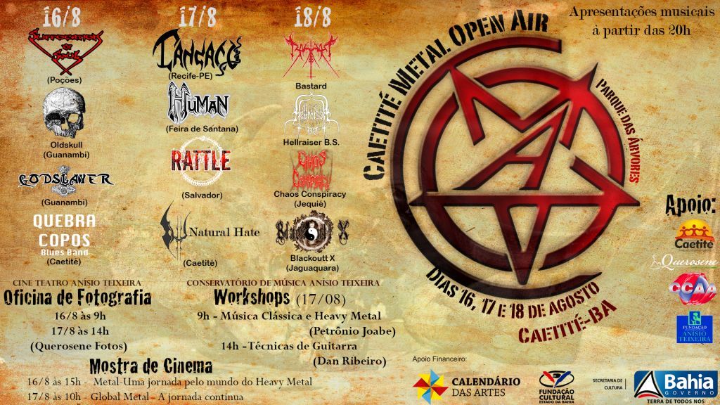 O Heavy Metal, ou simplesmente Metal, ecoará suas distorções amplificadas, seus solos de guitarra e vocais teatralizados durante três dias no município de Caetité, no Sertão da Bahia. Desta sexta a domingo, 16 a 18 de agosto, o gênero de rock vai ser o fundamento do Caetité Metal Open Air, festival pioneiro na cidade, reunindo shows, oficina de fotografia, workshops e mostra de cinema em torno deste universo. Todas as atividades são gratuitas. A iniciativa tem apoio através de premiação no edital Calendário das Artes, da Fundação Cultural do Estado da Bahia (FUNCEB), entidade vinculada à Secretaria de Cultura do Estado (SecultBA).