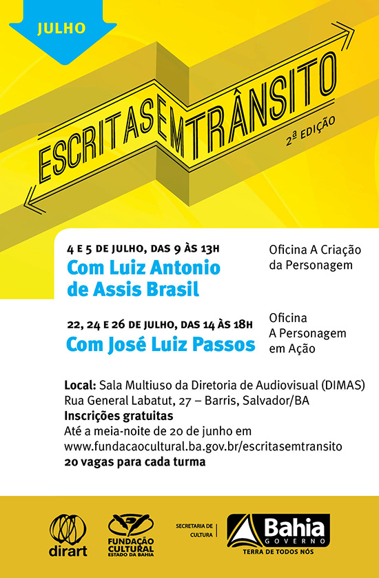 A Fundação Cultural do Estado da Bahia (FUNCEB), entidade vinculada à Secretaria de Cultura do Estado (SecultBA), abre inscrições para as duas turmas de julho da 2ª edição do Escritas em Trânsito, projeto que promove oficinas gratuitas ministradas por renomados autores da literatura contemporânea de língua portuguesa. Nos dias 4 e 5 de julho, das 9 às 13 horas, Luiz Antonio de Assis Brasil conduz a oficina A Criação da Personagem; depois, nos dias 22, 24 e 26 de julho, das 14 às 18 horas, José Luiz Passos apresenta A Personagem em Ação. Ambos os cursos acontecem na Diretoria de Audiovisual (DIMAS), nos Barris, em Salvador. Interessados devem se inscrever através de formulário online disponível em www.fundacaocultural.ba.gov.br/escritasemtransito, até a meia-noite de 20 de junho.