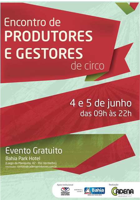 Com o propósito de debater temas ligados à produção e gestão da atividade circense, o Encontro de Produtores e Gestores de Circo será realizado em Salvador, no Bahia Park Hotel, no bairro do Rio Vermelho, nos dias 4 e 5 de junho (terça, das 14 às 22 horas; quarta, das 9 às 22 horas), aberto ao público. Serão realizadas palestras e mesas redondas que dialogam com a pauta em questão. A iniciativa, apresentada pelo artista e produtor circense Robson Mol, foi contemplada pelo Prêmio Meses Temáticos do Circo, Dança e Teatro – Diálogos e Reflexões, promovido pela Fundação Cultural do Estado da Bahia (FUNCEB), entidade vinculada à Secretaria de Cultura do Governo do Estado (SecultBA).