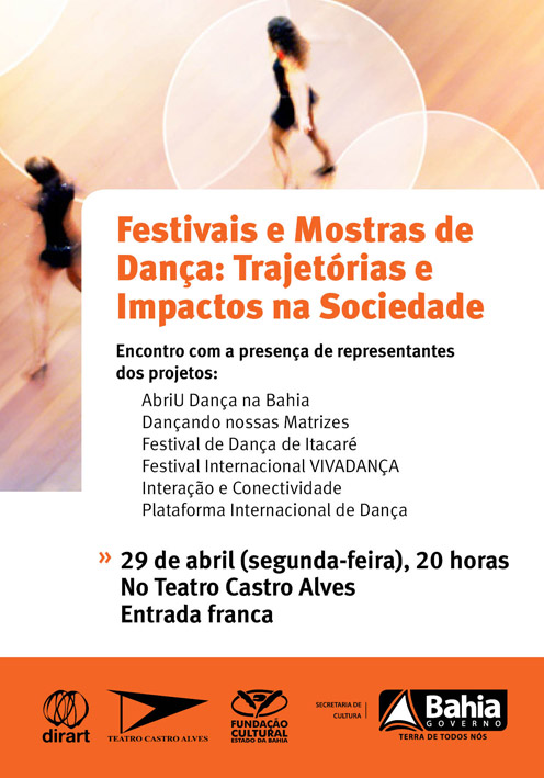 Em 29 de abril (segunda-feira), Dia Internacional da Dança, às 20 horas, na sala principal do Teatro Castro Alves (TCA), será realizado o encontro Festivais e Mostras de Dança: Trajetórias e Impactos na Sociedade. O debate, promovido pela Fundação Cultural do Estado da Bahia (FUNCEB), entidade vinculada à Secretaria de Cultura do Governo do Estado (SecultBA), vai reunir representantes de importantes eventos de difusão da dança na Bahia, com o objetivo de provocar produtores, classe artística e público interessado a refletirem sobre a relevância destas ações no estado e como elas se refletem no setor. A entrada é franca.