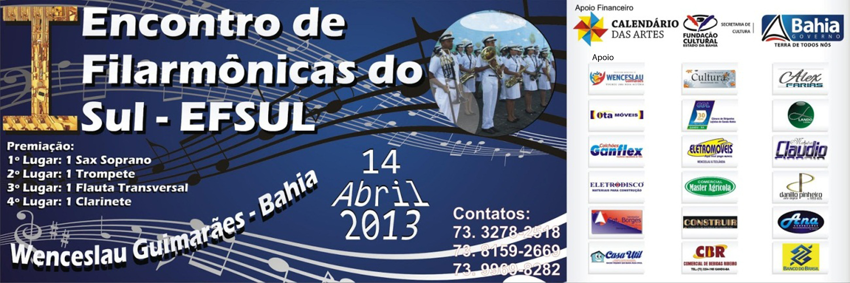 Dez filarmônicas da Bahia se apresentam em palco na Praça Nelson Davi Ribeiro, na cidade de Wenceslau Guimarães, no Território de Identidade do Baixo Sul, no I Encontro de Filarmônicas do Sul (EFSUL), neste fim de semana, dias 13 e 14 de abril. Com bandas oriundas de diversas regiões, o evento, que é aberto ao público gratuitamente, realiza uma competição que vai premiar os melhores grupos com instrumentos musicais. O projeto, organizado pelo músico Lando Leal, trombonista da Associação Filarmônica Amigos da Música (AFAM), tem apoio concedido pela 2ª Chamada do edital Calendário das Artes 2012, da Fundação Cultural do Estado da Bahia (FUNCEB), entidade vinculada à Secretaria de Cultura do Estado (SecultBA).