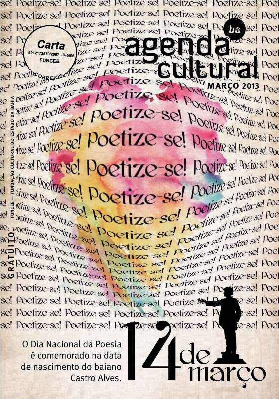 Neste mês, a Agenda Cultural destaca o Dia Nacional da Poesia, comemorado em 14 de março, data de nascimento do baiano Castro Alves. Além das celebrações realizadas em Cabaceiras do Paraguaçu, onde nasceu o poeta, há outros eventos de valorização da poesia que integram as festividades em diferentes locais. Nas páginas de Intervalo desta edição, a homenagem para a data também vem com a publicação de trabalhos com o tema "Poesia em Imagens".