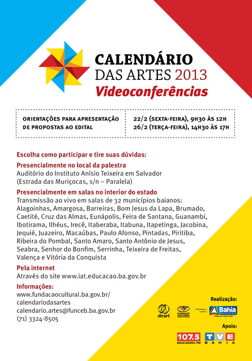 Para divulgar e dar instruções sobre a 1ª Chamada do Calendário das Artes 2013, a Fundação Cultural do Estado da Bahia (FUNCEB), entidade vinculada à Secretaria de Cultura do Governo do Estado (SecultBA), promotora do edital, vai realizar duas videoconferências: no dia 22 de fevereiro (sexta-feira), no turno matutino (9h30 às 12 horas), e no dia 26 de fevereiro (terça-feira), no turno vespertino (14h30 às 17 horas). As videoconferências são conduzidas pela equipe da FUNCEB e podem ser acompanhadas ao vivo pela internet (no endereço www.iat.educacao.ba.gov.br) ou em pontos de exibição localizados em 33 municípios baianos, incluindo o próprio local de transmissão das palestras – o auditório do Instituto Anísio Teixeira (IAT), em Salvador.