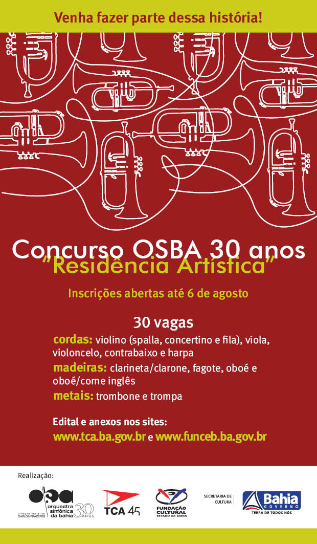 Em 2012, a Orquestra Sinfônica da Bahia (OSBA) comemora 30 anos. Entre as ações de difusão, formação, intercâmbio e memória que vêm sendo realizadas na celebração deste marco, está o Concurso OSBA 30 Anos – "Residência Artística". Com inscrições abertas até 6 de agosto, o certame é promovido pela Fundação Cultural do Estado da Bahia (FUNCEB), unidade da Secretaria de Cultura do Estado (SecultBA), através do Teatro Castro Alves (TCA), que abriga os corpos estáveis de música e dança do Estado: OSBA e Balé Teatro Castro Alves (BTCA). O texto do edital e seus anexos estão disponíveis aqui.
