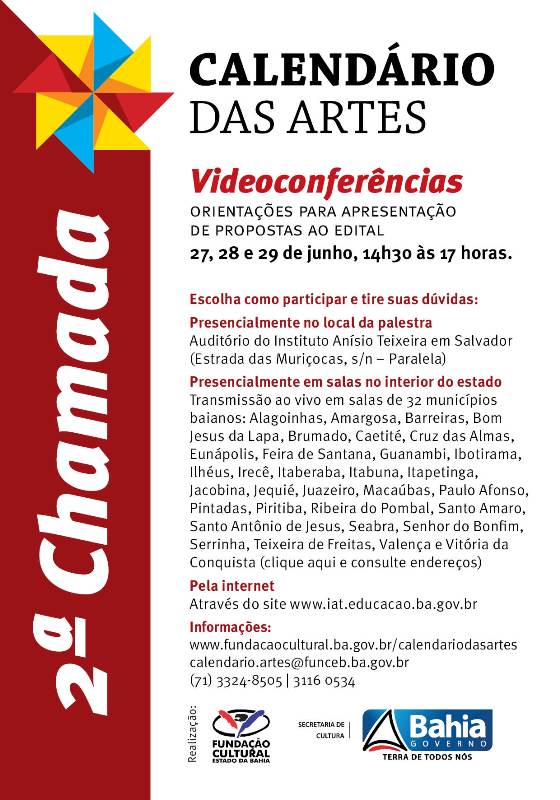 Para divulgar e dar instruções sobre a 2ª Chamada do Calendário das Artes, a Fundação Cultural do Estado da Bahia (FUNCEB), unidade da Secretaria de Cultura do Estado (SecultBA), promotora do edital, vai realizar três videoconferências, nos dias 27, 28 e 29 de junho, das 14h30 às 17 horas. As videoconferências são conduzidas pela equipe da FUNCEB, a partir do auditório do Instituto Anísio Teixeira (IAT), em Salvador, e podem ser acompanhadas ao vivo pela internet (no endereço www.iat.educacao.ba.gov.br) ou em pontos de exibição localizados em 32 municípios baianos.