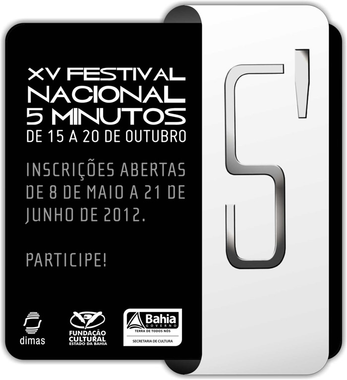 A Fundação Cultural do Estado da Bahia (FUNCEB), unidade da Secretaria de Cultura do Estado (SecultBA), através da sua Diretoria de Audiovisual (DIMAS), mantém abertas até 21 de junho as inscrições para a 15ª edição do Festival Nacional 5 Minutos. O concurso visa à seleção e à premiação de vídeos com duração de até cinco minutos, de temática e estética livres, com o objetivo de incentivar a experimentação, a produção e a difusão desta linguagem no Brasil. O texto do edital, bem como seus anexos, pode ser consultado aqui.