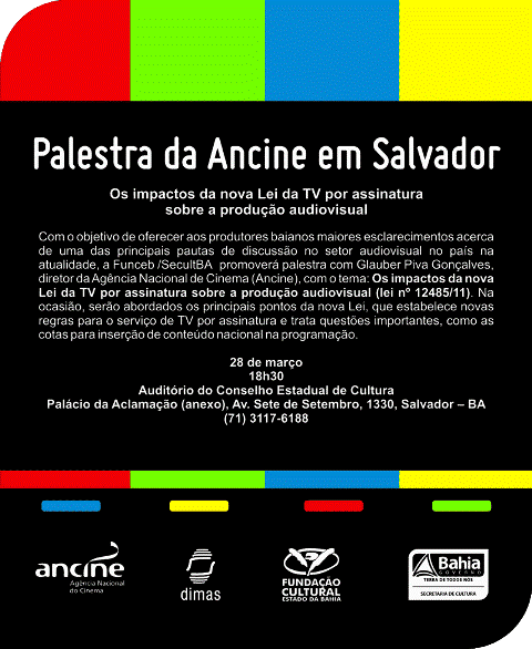 A Fundação Cultural do Estado da Bahia (FUNCEB), unidade da Secretaria de Cultura do Estado (SEcultBA), através da sua Diretoria de Audiovisual (DIMAS), promove em Salvador a palestra Os Impactos da Nova Lei da TV por Assinatura sobre a Produção do Audiovisual, que será conduzida por Glauber Piva Gonçalves, diretor da Agência Nacional do Cinema (Ancine), vinculada ao Ministério da Cultura (MinC). O evento, aberto ao público, acontece na próxima quarta-feira, 28 de março, às 18h30, no auditório do Conselho Estadual de Cultura. O objetivo é de oferecer aos produtores baianos a oportunidade de ter esclarecimentos acerca de uma das principais pautas de discussão no setor audiovisual brasileiro na atualidade.