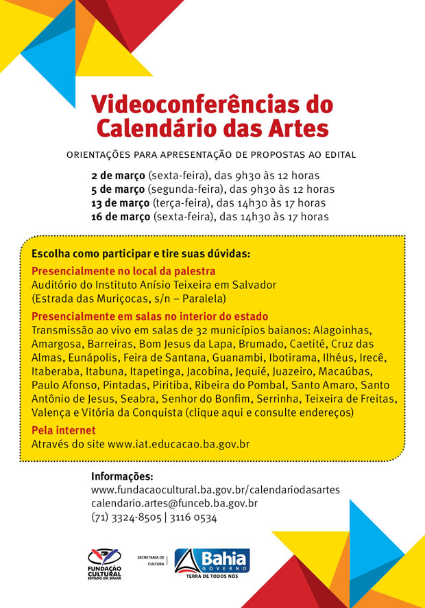 Para divulgar e dar instruções sobre a 1ª Chamada do Calendário das Artes, a Fundação Cultural do Estado da Bahia (FUNCEB), unidade da Secretaria de Cultura do Estado (SecultBA), promotora do edital, vai realizar a série de Videoconferências do Calendário das Artes. Serão quatro momentos de orientações: 2 de março (sexta-feira), das 9h30 às 12 horas; 5 de março (segunda-feira), das 9h30 às 12 horas; 13 de março (terça-feira), das 14h30 às 17 horas; e 16 de março (sexta-feira), das 14h30 às 17 horas. As videoconferências são conduzidas pela equipe da FUNCEB e podem ser acompanhadas ao vivo pela internet (no endereço www.iat.educacao.ba.gov.br) ou em 34 pontos de exibição localizados na capital e mais 32 municípios baianos, incluindo o próprio local de gravação das palestras – o auditório do Instituto Anísio Teixeira (IAT), em Salvador.