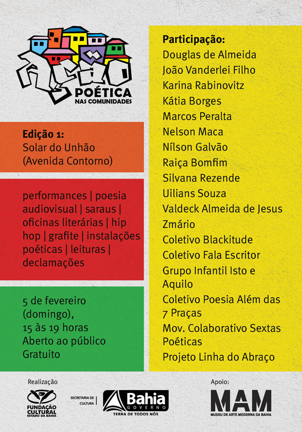 A Fundação Cultural do Estado da Bahia (FUNCEB), unidade da Secretaria de Cultura do Estado (SecultBA), lança o projeto Ação Poética nas Comunidades, que se propõe a levar a poesia, em sua diversidade de estilos e abordagens, a comunidades populares de Salvador. A estreia se dá no dia 5 de fevereiro (domingo), das 15 às 19 horas, na comunidade do Solar do Unhão, na Avenida Contorno, localizada ao lado do Museu de Arte Moderna da Bahia (MAM-BA), apoiador desta primeira edição. O evento é gratuito, aberto ao público, e terá a participação de 12 poetas e coletivos que levarão performance, poesia audiovisual, saraus, oficinas, hip hop, grafite, instalações poéticas, leituras, declamações e uma série de atividades envolvendo esta arte.