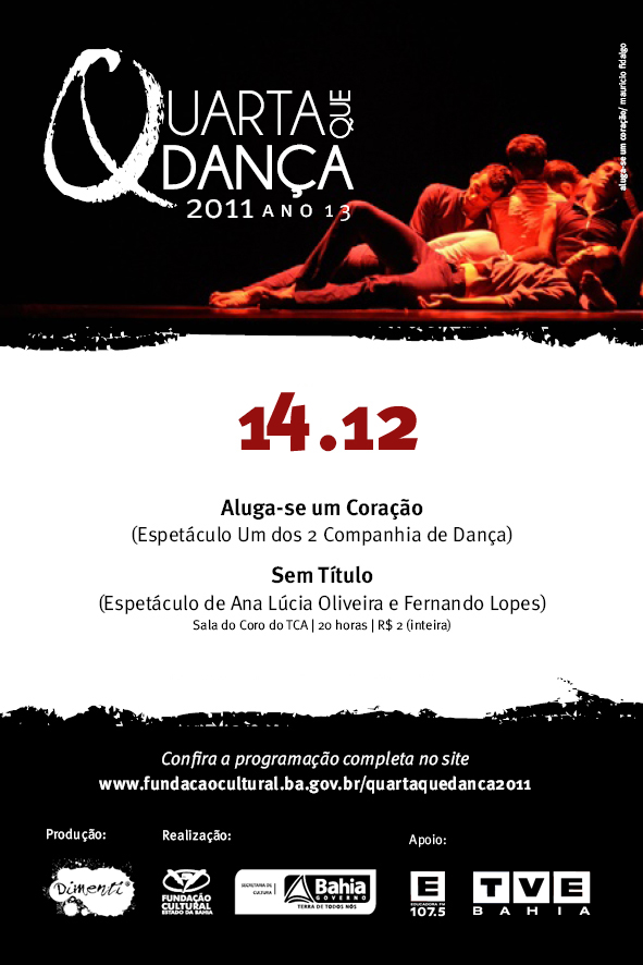 Após exatos três meses em cartaz em todas as quartas-feiras, tendo início em 14 de setembro passado, contabilizando 45 apresentações de 15 trabalhos de dança, o Quarta que Dança 2011 se encerra na próxima quarta-feira, 14 de dezembro. Na despedida desta 13ª edição do projeto, a Sala do Coro do TCA é palco para a encenação de dois espetáculos em sequência: Aluga-se um Coração, da Qualquer Um dos 2 Companhia de Dança, oriunda de Juazeiro, e Sem Título, de Ana Lúcia Oliveira e Fernando Lopes, de Salvador. A sessão começa às 20 horas e o ingresso custa R$ 2 (inteira).