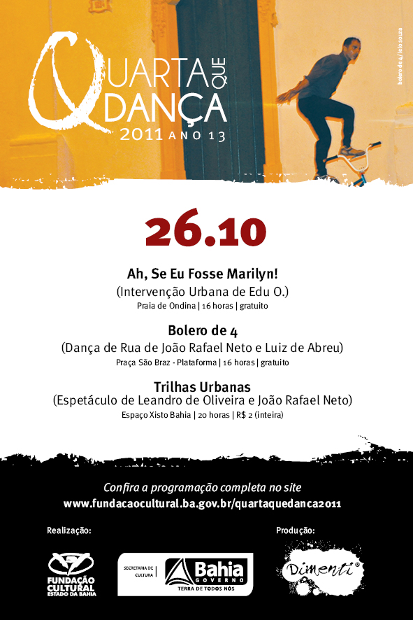Na próxima quarta-feira, 26 de outubro, o Quarta que Dança 2011 apresenta três trabalhos de diferentes formatos e em locais distintos da cidade de Salvador. A Intervenção Urbana Ah, Se Eu Fosse Marilyn!, de Edu O., ocupa a Praia de Ondina, às 16 horas, numa performance aberta ao público. Também gratuita é a Dança de Rua Bolero de 4, de João Rafael Neto e Luiz de Abreu, que estreia na programação do projeto com uma apresentação na Praça São Braz, em Plataforma, às 16 horas. Já o espetáculo Trilhas Urbanas, de Leandro de Oliveira e João Rafael Neto, encerra a participação no Quarta que Dança, estando, desta vez, no palco do Espaço Xisto Bahia (Barris), às 20 horas, com ingresso a R$ 2 (inteira).