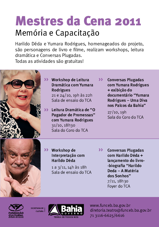 Iniciativa da Secretaria de Cultura do Estado da Bahia (SecultBA) executada através da Fundação Cultural do Estado da Bahia (FUNCEB), o Mestres da Cena visa ao reconhecimento dos grandes mestres do teatro da Bahia, reverenciando e divulgando sua importância e trajetórias. Lançado em 2009, quando homenageou o ator Harildo Déda, e reeditado em 2010, quando se dedicou à atriz Yumara Rodrigues, o projeto se realiza em 2011 com lançamentos de documentos de memória sobre estes dois nomes de referência das artes cênicas baianas, que ainda conduzem atividades de compartilhamento de experiências: cada um deles terá uma sessão do Conversas Plugadas e promoverá workshops, que têm agora inscrições abertas. Todos os eventos envolvidos são gratuitos.