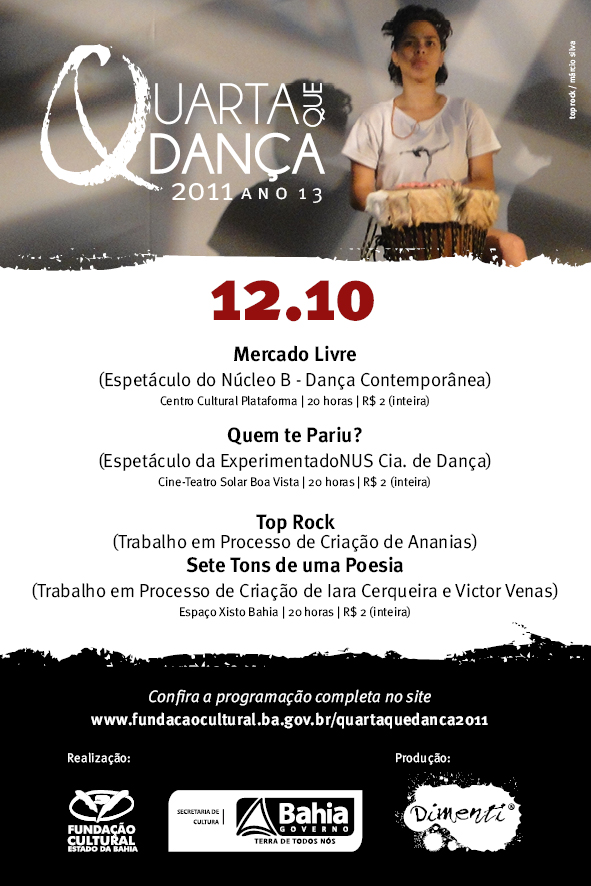 Nesta quarta-feira, 12 de outubro, feriado do dia da padroeira do Brasil, Nossa Senhora Aparecida, o projeto Quarta que Dança 2011 insere com destaque a dança na programação cultural de Salvador. Dois espetáculos serão encenados: Mercado Livre, do Núcleo B – Dança Contemporânea, no Centro Cultural Plataforma; e Quem te Pariu?, da ExperimentadoNUS Cia. de Dança, no Cine-Teatro Solar Boa Vista (Engenho Velho de Brotas). Além disso, dois Trabalhos em Processo de Criação vão estrear na programação: Sete Tons de uma Poesia, de Iara Cerqueira e Victor Venas, e Top Rock, de Ananias, que dividem o palco do Espaço Xisto Bahia (Barris) com apresentações em sequência. Todas as sessões se iniciam às 20 horas, com ingresso a R$ 2 (inteira).