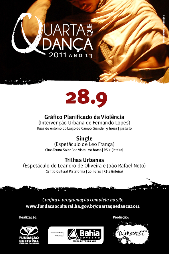 Em sua terceira semana de realização, a 13ª edição do Quarta que Dança promove mais uma sessão dos três trabalhos apresentados na última quarta-feira, desta vez em novos locais, colocando em prática a proposta de diversificação dos espaços alcançados e ampliação do acesso a apresentações de Dança. A intervenção urbana Gráfico Planificado da Violência, de Fernando Lopes, ocupa as ruas do entorno do Largo do Campo Grande, às 9 horas da manhã, gratuitamente. Já os espetáculos Single, de Leo França, no palco do Cine-Teatro Solar Boa Vista, e Trilhas Urbanas, de Leandro de Oliveira e João Rafael Neto, no Centro Cultural Plataforma, são encenados às 20 horas, com ingresso a R$ 2 (inteira). O Quarta que Dança é um projeto da Fundação Cultural do Estado da Bahia (FUNCEB), unidade da Secretaria de Cultura do Estado da Bahia (SecultBA). Mais informações: www.fundacaocultural.ba.gov.br/quartaquedanca2011