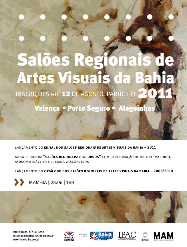 A Fundação Cultural do Estado da Bahia (FUNCEB), unidade da Secretaria de Cultura do Estado (SecultBA), lança nesta terça-feira, 28 de junho, a edição 2011 do edital Salões Regionais de Artes Visuais da Bahia. Além da abertura das inscrições, que seguem até 12 de agosto, será realizado, neste mesmo dia, no Museu de Arte Moderna da Bahia, às 18 horas, um evento que marca a ocasião e ainda promove o lançamento do catálogo Salões Regionais de Artes Visuais da Bahia 2009/2010 e a mesa-redonda "Salões Regionais: Percursos", com participação dos artistas plásticos Justino Marinho e Ayrson Heráclito, ao lado de Luciana Vasconcelos, coordenadora de Artes Visuais da FUNCEB. O evento é aberto ao público.
