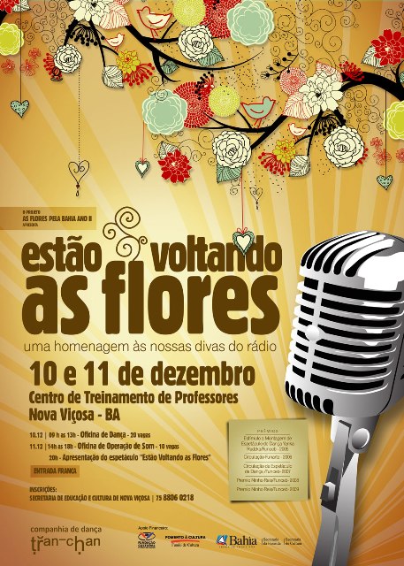 Estão Voltando as Flores, espetáculo de dança da Companhia Tran Chan, faz apresentação única no município de Nova Viçosa, interior da Bahia, neste sábado, 11 de dezembro, às 20 horas, no Centro de Treinamento para Professores de Nova Viçosa, com entrada franca. Selecionada na edição 2009 do edital Ninho Reis – Apoio à Circulação de Espetáculos de Dança, promovido pela Fundação Cultural do Estado da Bahia (FUNCEB), unidade da Secretaria de Cultura do Estado (SecultBA), a montagem presta uma homenagem às divas do rádio e integra o projeto As Flores pela Bahia Ano II, que, em 2011, irá ainda chegar às cidades de Vitória da Conquista e Itapetinga.