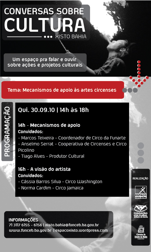 Depois de debater questões de "Manutenção de Grupos", "Residência e Ocupação de Espaços" e "Formação e Profissionalização do Artista", o Conversas sobre Cultura – Xisto Bahia chega à quarta edição nesta quinta-feira, 30 de setembro, para tratar do tema "Mecanismos de Apoio às Artes Circenses", das 14 às 18 horas. Instalado no foyer do Espaço Xisto Bahia (Barris) e aberto ao público, gratuitamente, o projeto reúne protagonistas exemplares dos temas propostos, para que eles próprios possam apresentar a realidade prática da atuação na área cultural, analisando iniciativas que vêm sendo utilizadas para a promoção da cultura e que se mostram como soluções para beneficiar artistas e público. (mais…)
