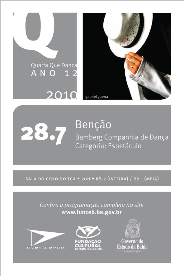 Nesta quarta-feira, 28 de julho, a 12ª edição do Quarta que Dança, promovida pela Fundação Cultural do Estado da Bahia – FUNCEB, unidade da Secretaria de Cultura do Estado – SecultBA, apresenta Benção, na Sala do Coro do Teatro Castro Alves, às 20 horas, com ingressos a R$ 2 e R$ 1. Trabalho da Bamberg Cia. de Dança, o espetáculo homenageia o centenário do samba e a canção "Samba da Benção", de Vinícius de Moraes. A trilha sonora é composta por grandes sucessos de consagrados sambistas brasileiros, como Batatinha, João Bosco, Cartola, Noel Rosa e o próprio Vinícius. O figurino é inspirado na história do samba e, ainda que contemporâneo, faz um retorno à originalidade da música.