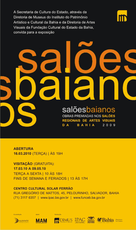 A partir de 16 de março, às 19h, o que há de mais recente na produção de artes visuais da Bahia estará em cartaz em Salões Baianos 2010, na Galeria Solar Ferrão (Centro Cultural Solar Ferrão/ Pelourinho/Salvador). Organizada pela Diretoria de Museus do Instituto do Patrimônio Artístico e Cultural da Bahia (Dimus/IPAC) e pela Diretoria de Artes Visuais da Fundação Cultural do Estado (Funceb), a exposição apresentará as 17 obras premiadas nos editais Salões Regionais de Artes Visuais da Bahia 2009, que, no ano passado, foram promovidos em Valença, Juazeiro e Porto Seguro. A mostra, que fica em cartaz até maio, reúne diversos formatos artísticos, como pintura, fotografia, instalação, vídeo, escultura, serigrafia e performance. (mais…)