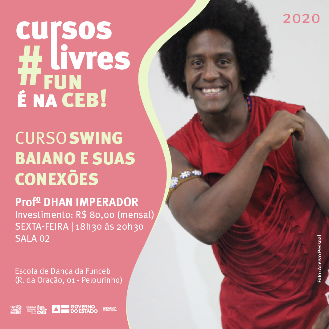 Swing Baiano e suas ConexõesJá o curso de Swing Baiano e suas Conexões, com o professor Dhan Imperador será ministrado às sextas-feiras, das 18h30 às 20h30, na Sala 2 da Escola de Dança da Funceb. O investimento é de R$80 (mensal).