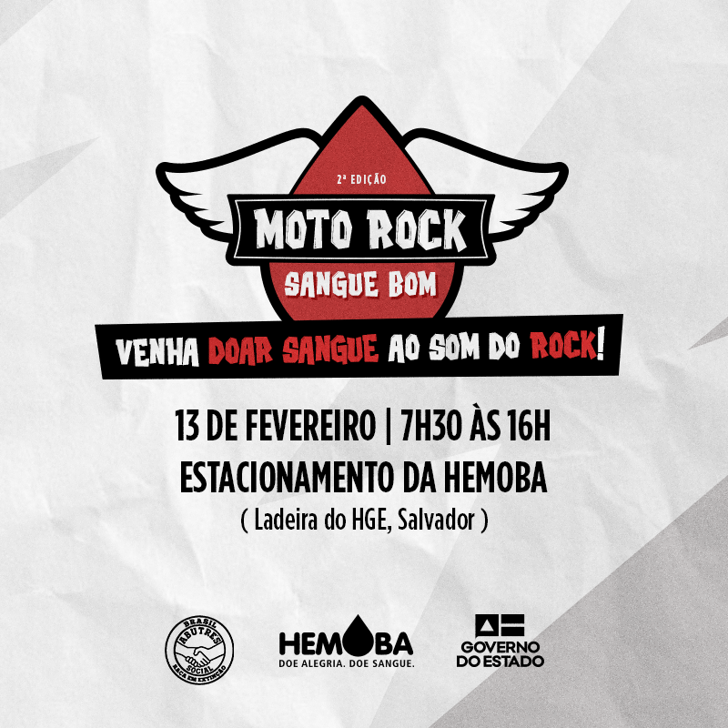 A Hemoba e os motoclubes da Bahia, em uma parceria que segue pelo segundo ano, realizam neste sábado (13) a 2ª edição do Motorock Sangue Bom, que acontecerá das 7h30 às 16h30, no estacionamento da Hemoba, na Vasco da Gama. O evento chama atenção especial à segurança e ao cuidado no trânsito. Mesmo com o isolamento social gerado pela pandemia, as solicitações transfusionais para acidentes de trânsitos vêm aumentando.