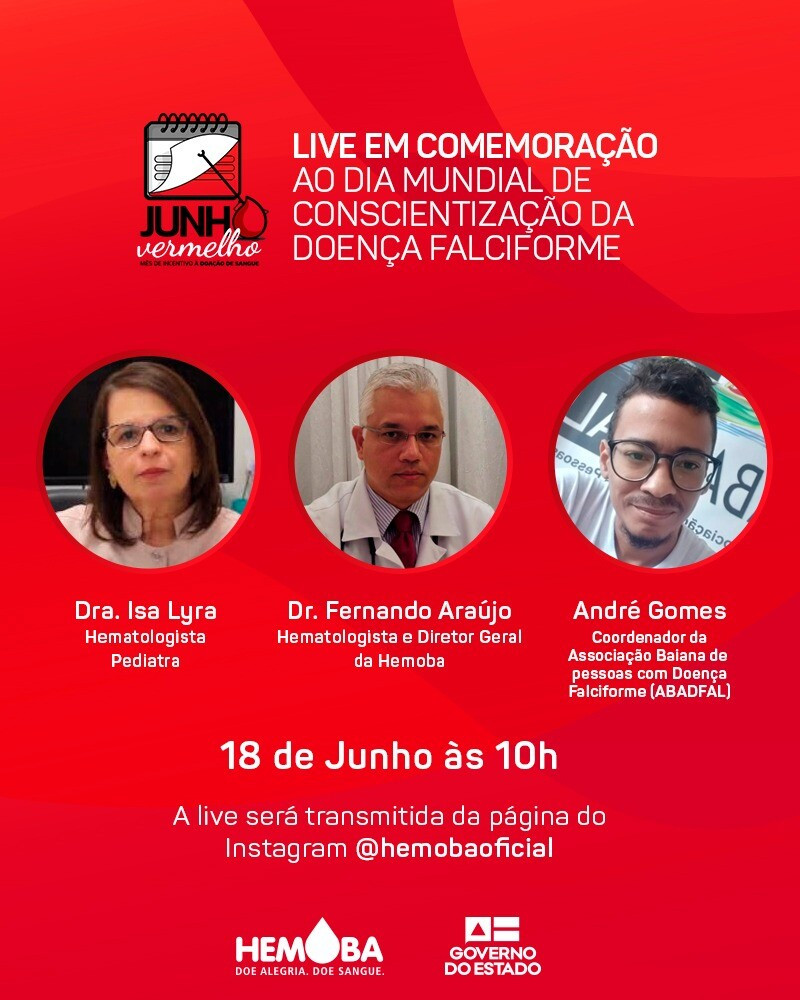 A programação online contará com a participação de Fernando Araújo, hematologista e diretor geral da Hemoba, Isa Lyra, hematologista pediatra do Ambulatório da Hemoba e André Gomes, coordenador da Associação Baiana de pessoas com Doença Falciforme (ABADFAL) e vai abordar temas como avanços no tratamento e qualidade de vida.