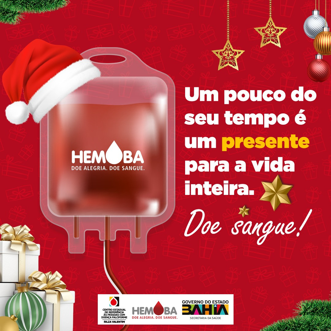Atendimento no período natalino – No período natalino, as unidades da Hemoba funcionarão normalmente de segunda a sexta-feira. No sábado, dia 23/12, a sede em Salvador atenderá das 7h30 às 13h, e as unidades móveis de coleta estarão no Salvador Shopping, (18 a 23/12) e no Shopping Bela Vista (19 a 23/12), das 8h às 16h. Em 25/12 e 01/12, todas as unidades, na capital e no interior, permanecerão fechadas.