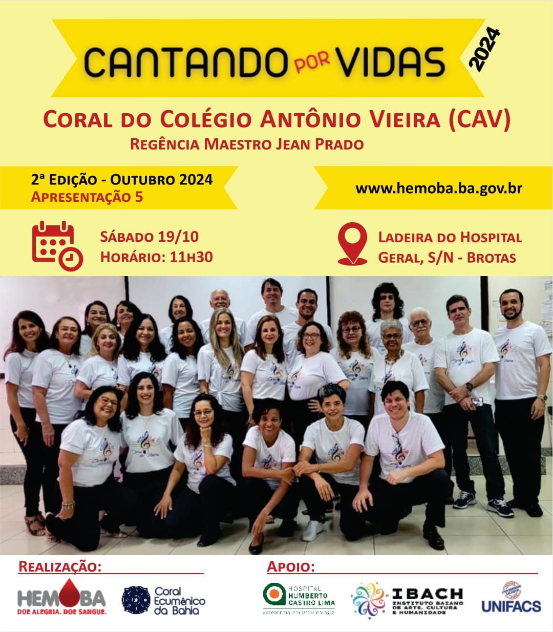 O Coral de Adultos do Colégio Antônio Vieira (CAV) fará uma apresentação, às 11h30, no próximo sábado (19), na sede da Hemoba (Av. Vasco da Gama), em Salvador. A programação faz parte do projeto "Cantando por Vidas", fruto de uma parceria entre a instituição e o Instituto Baiano de Arte, Cultura e Humanidade (IBACH), que objetiva promover a conscientização sobre a importância e a necessidade da doação voluntária de sangue. Fundado em 2016, o coral tem participado de vários eventos na capital baiana, como Encontro de Corais e Feira da Paróquia da Vitória, além de ações da própria escola, como o Concerto da Primavera e apresentações de Natal.
