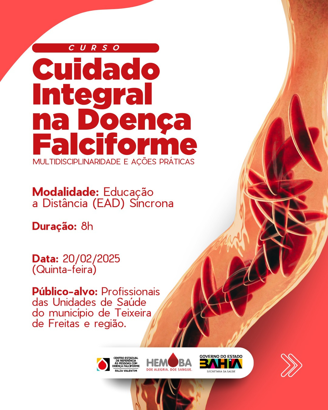 O Centro Estadual de Referência às Pessoas com Doença Falciforme Rilza Valentim (CERPDF/HEMOBA) promove, nesta quinta-feira (20), o curso de capacitação “Cuidado Integral na Doença Falciforme: Multidisciplinaridade e Ações Práticas” para profissionais das unidades de saúde de Teixeira de Freitas e região. A formação, com carga horária de 8 horas, será realizada na modalidade a distância, com aulas síncronas, e tem o objetivo de qualificar o atendimento às pessoas com doença falciforme, fortalecendo o cuidado multiprofissional integrado e humanizado na atenção básica dos municípios.