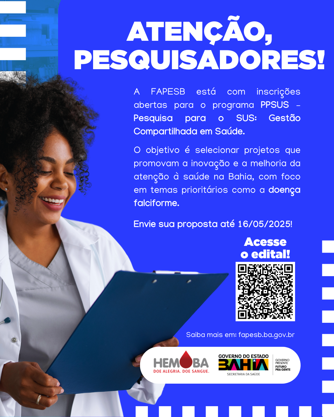 Para mais informações, acesse o link: https://www.fapesb.ba.gov.br/chamada-fapesb-no-032025-programa-pesquisa-para-o-sus-gestao-compartilhada-em-saude-ppsus/.