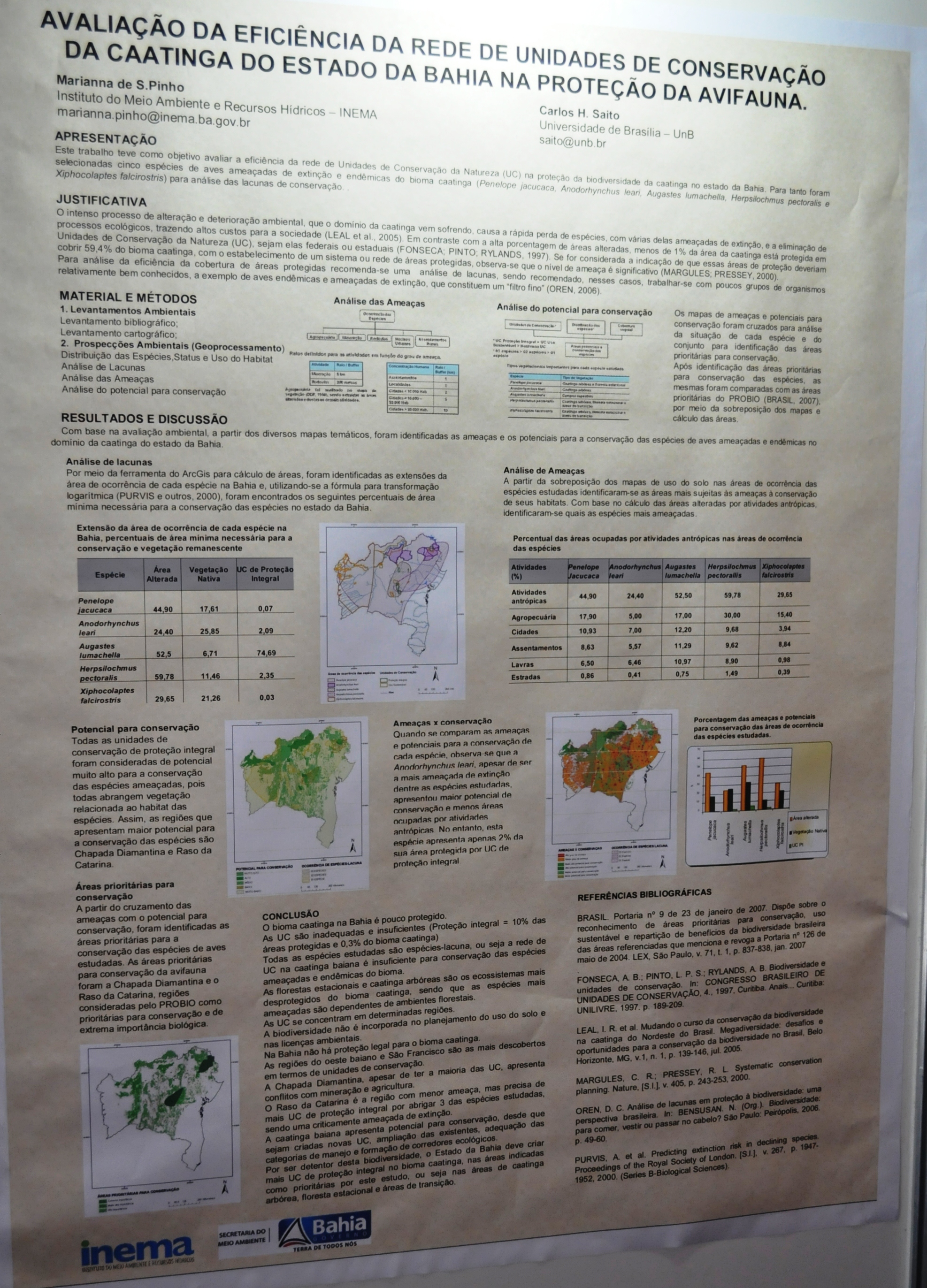 O evento conta com a participação de pesquisadores das áreas de Ecologia de Paisagens e de Conservação, além de diversos profissionais interessados nos recentes avanços dos Sistemas de Informações Geográficas aplicados à conservação ambiental. O Inema se faz presente no encontro com o painel de título ‘Avaliação da eficiência da rede de Unidades de Conservação da natureza na proteção da avifauna da caatinga da Bahia’ e com a realização do seminário ‘A presença das APAs e a Manutenção dos Fragmentos de Mata Atlântica no Litoral Norte do Estado da Bahia’ apresentados, respectivamente, pela especialista em meio ambiente, Marianna Pinho, e pela gestora da Área de Proteção Ambiental (APA) Litoral Norte, Adriana Batista.