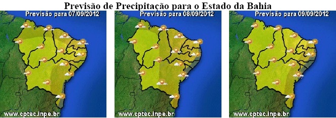As condições do tempo para a Bahia, durante o final de semana prolongado da Independência, continuam sendo influenciadas por uma intensa massa de ar quente e seco, mantendo o céu ensolarado e com poucas chuvas na maior parte do Estado. Essa massa de ar que já vem atuando há várias semanas sobre as Regiões Sudeste, Centro-Oeste e Nordeste brasileiro também é responsável pela redução dos índices de umidade do ar, bem como, pela elevação nas temperaturas.