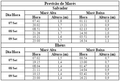 Entre os dias 07 (sexta-feira) e 09 (domingo) de setembro, a altura máxima da maré deverá atingir valores de 1,4 a 1,8 metros em torno das 08h00min e das 20h00min. Já as alturas mínimas deverão ser registradas em torno de 02h00min e das 14h00min, com valores variando de 0,7 a 1,1 metro. As ondas deverão ter agitação de moderada a fraca, com altura máxima podendo chegar a 1,5 metros.