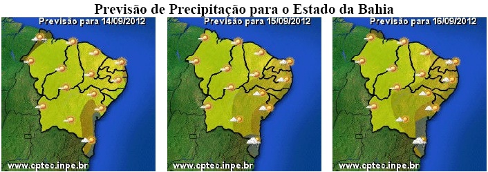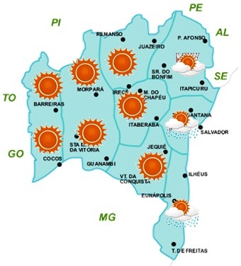 Por outro lado, nas regiões do Recôncavo, Nordeste e Sul da Bahia, ainda são os ventos úmidos que sopram do Oceano Atlântico que deixam o céu parcialmente nublado a claro. Durante a noite e nas primeiras horas da manhã, há possibilidade de ocorrer eventos isolados de chuvas fracas, principalmente, nas áreas mais próximas ao litoral (incluindo a cidade de Salvador e região metropolitana). As temperaturas nessas regiões do Estado também continuam em elevação, com valores variando de 18°C (mínimas) a 32°C (máximas).