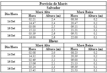 Entre os dias 14/09 (sexta-feira) e 16/09 (domingo), a altura máxima da maré deverá atingir valores de 2,0 a 2,6 metros em torno das 03h00min e das 15h00min. Já as alturas mínimas deverão ser registradas em torno de 09h00min e das 21h00min, com valores variando de 0,1 a 0,2 metro. As ondas deverão ter agitação fraca, com altura máxima podendo chegar a 1,5 metros.