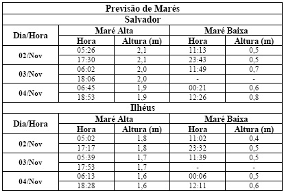 Entre os dias 02 (sexta-feira) e 04 (domingo) de novembro, a altura máxima da maré deverá atingir valores de 1,6 a 2,1 metros em torno das 06h00min e das 18h00min. Já as alturas mínimas deverão ser registradas em torno de 00h00min e das 12h00min, com valores variando de 0,4 a 0,8 metro. As ondas deverão ter agitação fraca, com altura máxima podendo chegar a 1,5 metros.