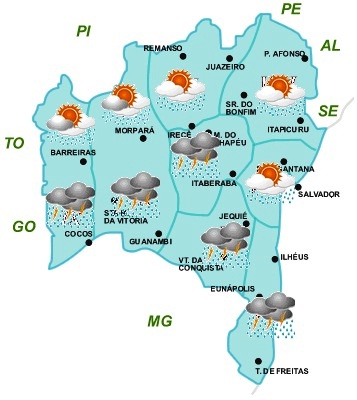 As condições do tempo para o final de semana na Bahia continuam sem mudanças significativas, ou seja, o calor e os elevados índices de umidade do ar manterão o céu encoberto e chuvoso na maior parte do Estado. Nesse período as chuvas mais expressivas estão previstas para as regiões Sul, Sudoeste, Chapada Diamantina, Oeste e São Francisco, onde também deverão ocorrer trovoadas no final da tarde e durante a noite.