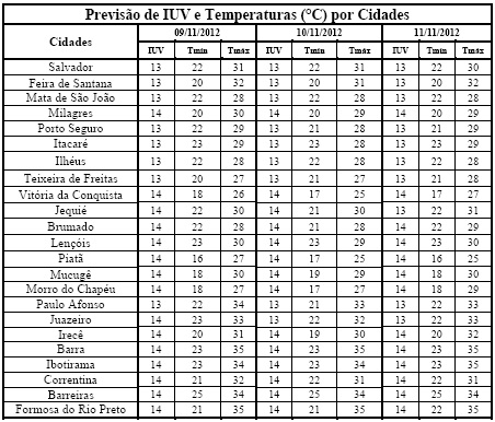 Os Índices de Radiação Ultravioleta (IUV’s) previstos para o período de sexta-feira a domingo deverão variar de 13 a 14, que segundo a Organização Mundial de Saúde (OMS) fazem parte da categoria “Extrema”. Com isso, cuidados como evitar exposição prolongada à radiação solar, principalmente nos horários das 10 às 16 horas, o uso de protetor/filtro solar, chapéus, bonés, óculos escuros e roupas leves são essenciais para minimizar danos à saúde, sobretudo a pele e aos olhos.