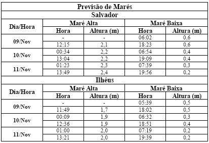Entre os dias 09 (sexta-feira) e 11 (domingo) de novembro, a altura máxima da maré deverá atingir valores de 1,7 a 2,4 metros em torno de 01h00min e das 13h00min. Já as alturas mínimas deverão ser registradas em torno de 07h00min e das 19h00min, com valores variando de 0,2 a 0,6 metro. As ondas deverão ter agitação fraca, com altura máxima podendo chegar a 1,5 metros.