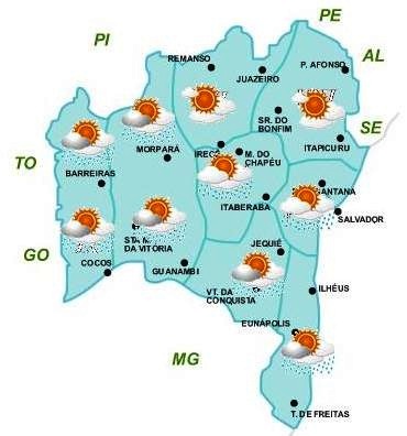 Para as regiões do Recôncavo, Norte e Nordeste do Estado, o predomínio será de céu parcialmente nublado a claro. Em áreas isoladas do Norte e Recôncavo, incluindo a capital baiana e região metropolitana, há chances de ocorrer chuvas fracas.