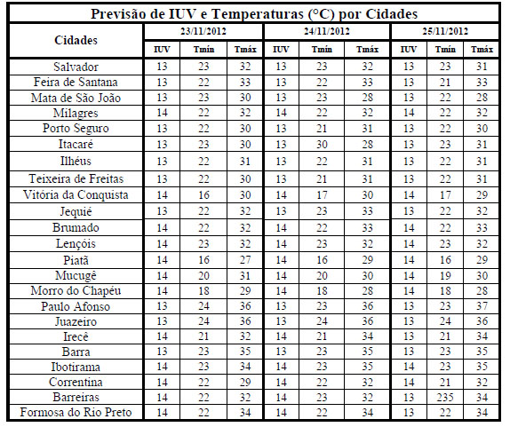 Os Índices de Radiação Ultravioleta (IUVs) previstos para o período de sexta-feira a domingo deverão variar de 13 a 14, que segundo a Organização Mundial de Saúde (OMS) fazem parte da categoria Extrema. Com isso, cuidados como evitar exposição prolongada à radiação solar, principalmente nos horários das 10 às 16 horas, o uso de protetor/filtro solar, chapéus, bonés, óculos escuros e roupas leves são essenciais para minimizar danos à saúde, sobretudo a pele e aos olhos.