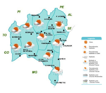Para este fim de semana o calor juntamente com a umidade elevada, ainda contribuirá na formação de nebulosidade e, consequentemente ocorrência de chuvas na maior parte da Bahia.