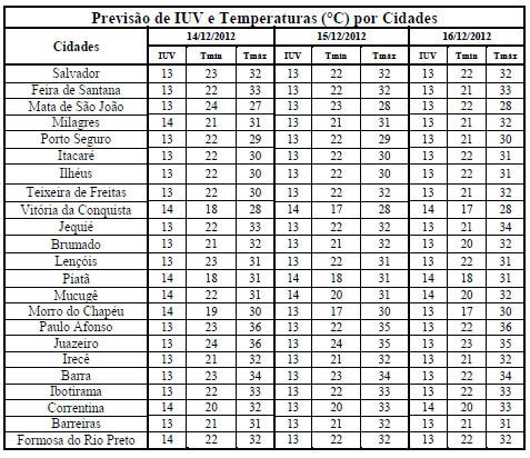 Os Índices de Radiação Ultravioleta (IUV’s) previstos para o período de 14/12 (sexta-feira) a 16/12 (domingo) deverão variar de 13 a 14, que segundo a Organização Mundial de Saúde (OMS) fazem parte da categoria “Extrema”. Com isso, cuidados como evitar exposição prolongada à radiação solar, principalmente nos horários das 10 às 16 horas, o uso de protetor/filtro solar, chapéus, bonés, óculos escuros e roupas leves são essenciais para minimizar danos à saúde, sobretudo a pele e aos olhos.