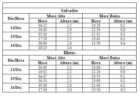 Entre os dias 14 (sexta-feira) e 16 (domingo) de dezembro, a altura máxima da maré deverá atingir valores de 2,0 a 2,6 metros em torno das 05h30min e das 17h30min. Já as alturas mínimas deverão ser registradas em torno de 11h30min e das 23h30min, com valores variando de 0,1 a 0,4 metros. As ondas deverão ter agitação fraca, com altura máxima podendo chegar a 1,5 metros.