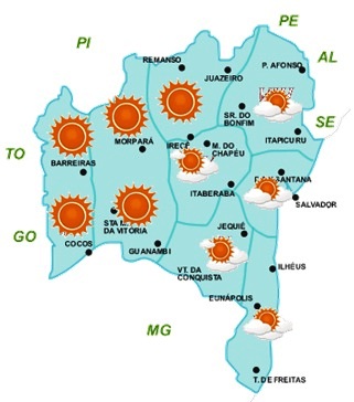 A chegada do verão será de temperaturas elevadas em todo o Estado, sendo nas regiões Norte, Nordeste e São Francisco onde são esperados os maiores índices, com máximas variando de 35°C a 37°C. Durante esse período, temperaturas mais amenas também estão previstas para algumas regiões do Estado, a exemplo das áreas serranas da Chapada Diamantina e Sudoeste, onde as mínimas podem chegar aos 18°C.