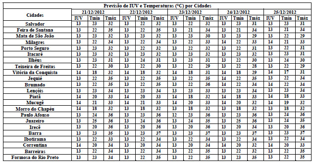 O final de semana prolongado devido às comemorações natalinas, também coincide com o início da estação do verão, o que aumenta a expectativa em relação à previsão do tempo. Para a Bahia, entre os dias 21 e 25 de dezembro, as condições do tempo continuam sendo influenciadas por uma intensa massa de ar quente e seco, mantendo o céu ensolarado e com poucas chuvas na maior parte do Estado. Apenas em áreas isoladas próximas ao litoral, é que poderão ocorrer eventos de chuvas fracas no final da tarde e início da noite.