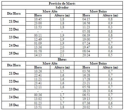 Entre os dias 21 (sexta-feira) e 25 (terça-feira) de dezembro, a altura máxima da maré deverá atingir valores de 1,5 a 2,1 metros nos período de: 23h a 01h e de 11h as 13h. Já as alturas mínimas deverão ocorrer entre às 05h e 07h e também entre 17h e as 19h00min, com valores variando entre 0,1 e 0,9 metro. As ondas deverão ter agitação fraca, com altura máxima podendo chegar a 1,5 metros.