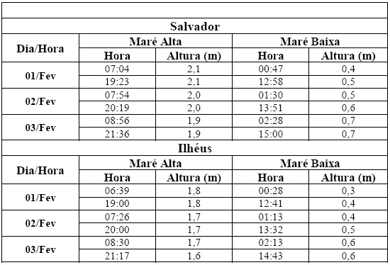 Entre os dias 01 (sexta-feira) e 03 (domingo) de fevereiro, a maré deverá atingir sua altura máxima em torno das 08h00min e das 20h00min, com valores variando de 1,6 a 2,1 metros. Já as alturas mínimas deverão ocorrer em torno das 02h00min e das 14h00min, com valores variando de 0,3 a 0,7 metro. As ondas deverão ter agitação fraca, com altura máxima podendo chegar a 1,5 metros.