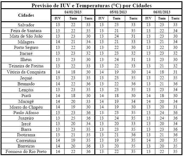 Os Índices de Radiação Ultravioleta (IUV’s) previstos para o período de 04/01 (sexta-feira) a 06/01 (domingo) deverão variar de 13 a 14, que segundo a Organização Mundial de Saúde (OMS) fazem parte da categoria “Extrema”. Com isso, cuidados como evitar exposição prolongada à radiação solar, principalmente nos horários das 10 às 16 horas, o uso de protetor/filtro solar, chapéus, bonés, óculos escuros e roupas leves são essenciais para minimizar danos à saúde, sobretudo a pele e aos olhos.